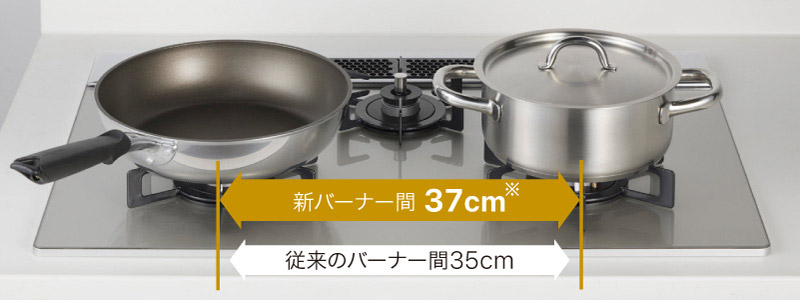 従来のコンロよりバーナー間がプラス2㎝大きくなりました。鍋やフライパンを同時に使ってもぶつかりにくいから、同時調理もカンタンに。